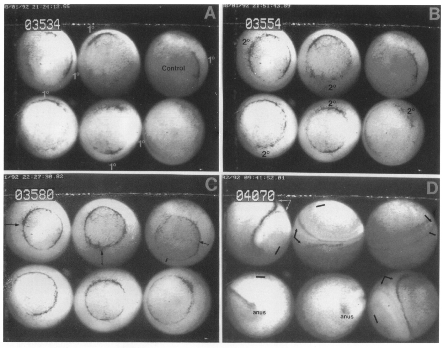 Figure 4. gsc mRNA Injection Induces Rapid Cell Movements in the Early Gastrula gsc mRNA was injected into two ventral vegetal blastomeres (0.5 ng each) of 16-cell stage embryos. One uninjected control embryo (control, upper right) and five experimental embryos were time lapse-recorded from the early gastrula ([A]-[C]) until the mid-neurula (D) stage using epiillumination. Single frames taken at the indicated time points are represented. (A) The position of the primary dorsal lip (1”) is indicated. (B) The position of secondary lips at the ventral side (2”) of all injected embryos is indicated. (C)Tracings of movement of individual cells of darker pigmentation filmed between time points A and C are indicated by the length of the arrows. Note that ectopic cell movement can be seen at the ventral side of injected embryos. (D) Mid-neurula embryos. The formation of a secondary axis in the anterior is indicated by the double arrows. All injected embryos developed a secondary axis in this experiment, but two embryos turned such that they are viewed from the posterior (anus). A single arrow indicates the anterior of the dorsal midline in the control embryo. The initial position of the blastopore is indicated by a bar. |