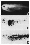 Figure 2. Cells Ectopically Expressing gsc Migrate to the Anterior of the Secondary Axis (A) Embryo (stage 36) with secondary axis resulting from a single C4 injection of 0.2 ng of gsc mRNA. (6) Same embryo as in (A), after visualization of coinjected CG lineage tracer. Note that labeled cells contribute mostly to the anterior of the secondary axis (arrowheads), while the posterior of the secondary axis is mostly unlabeled, as is the posterior of the main axis. (C) Control embryo injected with CG alone, showing labeling of lateral plate mesoderm, muscle, and epidermis as typically found in C4 lineage-traced blastomeres (Dale and Slack, 1987; Moody, 1987). Embryos injected with dgsc mRNA into C4 blastomeres did not develop secondary axes or ectopic muscle, but sometimes showed less lateral plate labeling for unknown reasons. A total of four experiments were carried out (n = 23). |