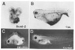 Figure 5. gsc Acts in the Organizer Proper (A and B) CG and either Xwnf-8 (A) or gsc mRNA (B) were coinjected into a D4 blastomere of 32cell embryos. Tadpoles (stage 34) are shown from the front (A) or the side (B). Note in (A) that Xwnf-8 has induced a twinned head, while labeled injected cells remain in the deep endoderm (n = 16). Note in (B) that gsc-injected cells form part of the secondary axis, where they concentrate in the anterior (n = 17). (C) Embryo injected with 50 pg of pCMVgsc plasmid DNA into each of two ventral vegetal blastomeres at the E-cell stage. (0) An uninjected embryo at the same stage. Note that the total length of the embryo in (C) is much shortened. Microinjection of DNA into 8- to 16-tell stage embryos produced secondary axes with an average frequency of 28% (two experiments, n = 107). Only one tadpole developed complete anterior structures (eye and cement gland; shown in [Cl). |