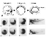 Figure 1, Cells Ectopically Expressing gsc Are Pluripotent and Recruit Neighboring Cells (Top left) Schematic diagram of a 32-cell embryo highlighting blastomeres used for injections. (Top right) Twinned tadpole resulting from microinjection into ventral blastomeres and the plane of section used in (A) are indicated. (A) Nuclear staining (Hoechst 33258) of a secondary embryo (stage 34) resulting from coinjection of 0.2 ng of synthetic gsc mRNA and 20 mg/ml FDA into two C4 blastomeres; only the gsc-induced secondary axis is shown in these oblique sections. (Aâ) FDA labeling of the progeny of the injected blastomeres in the same embryo shown in (A). Neural tissue is largely unlabeled (e.g., auditory vesicles), as is muscle in posterior areas (arrowheads in [Aâj). Labeled cells are found in all mesodermal tissues. Five embryos were serially sectioned and analyzed in this way. Note that labeled cells are more concentrated in the anterior region of the secondary axis (arrow in [Aâj). (B) Experimental design of a double labeling lineage tracing experiment in which the two C4 blastomeres were injected with rhodamine-dextran and gsc mRNA and the two overlying 84 cells with FDA alone. (C) Result of the experiment outlined in (B). The resulting secondary axis is labeled, with gsc-injected cells (red) contributing to notochord, muscle, and head mesoderm, while the overlying cells are recruited (green) to form auditory vesicles, neural tissue, and muscle in the secondary axis. Sections were 10 urn thick, explaining the yellow borders due to overlap of both types of cells. Six secondary axes were serially sectioned in this way; only two had notochords, but all of them had green and red muscle cells in the secondary axes. ap, animal pole: Av. auditory vesicle; d, dorsal; En, endoderm; Mu, muscle; Hm, head mesoderm; Ne, neural tissue; No, notochord; v, ventral; vp, vegetal pole. Bar is 50 pm. |