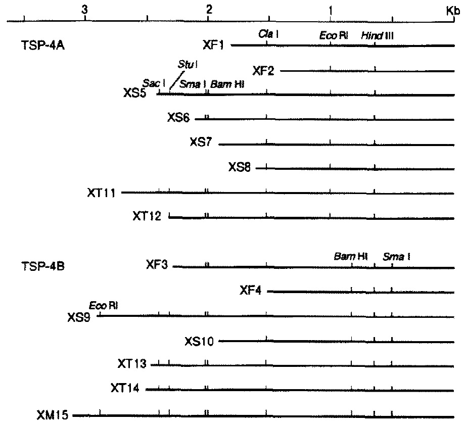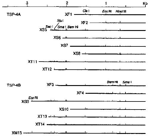 Figure 1. Alignment of Xenopus thrombospondin-4 clones. Restriction