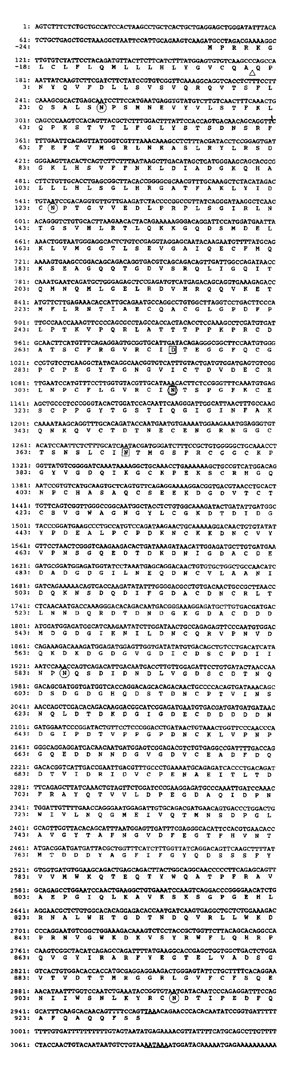 sites for potential N-linked glyeosylation are circled and the site for potential ~-hydroxylation is boxed. Note that asparagine(314) could