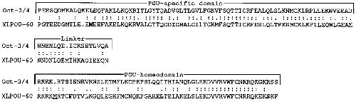 FIG. 2. A comparison of the amino acid sequences of the POU domains of XLPOU-60 and Oct-3/4. Identical residues are indicated with two
