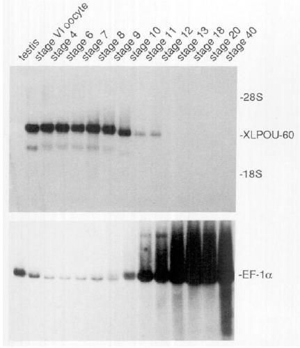 for the ubiquitously expressed gene EF-ln, which shows a complementary pattern of expression to XLPOU-60 (low maternal levels; increased
