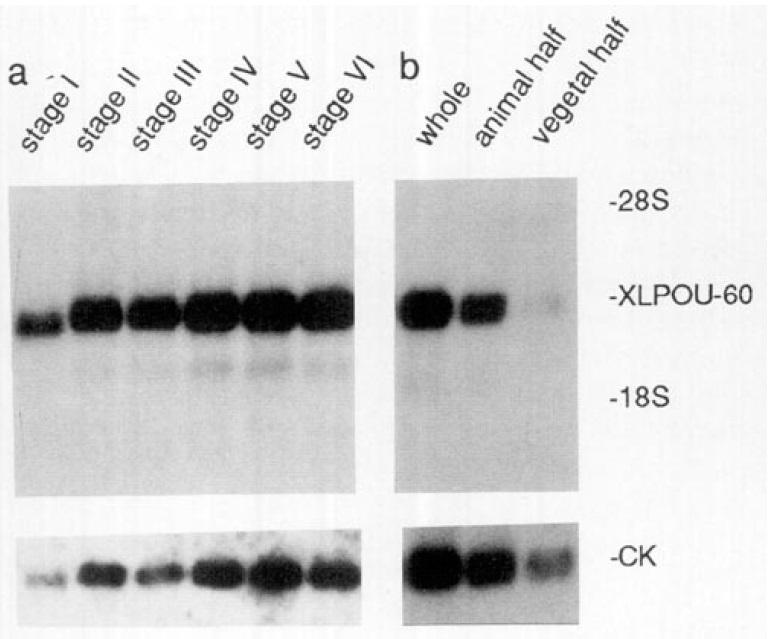 FIG. 3. (a) Northern blot showing expression of XLPOU-60 mRNA