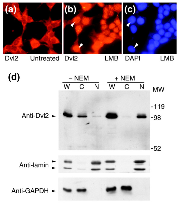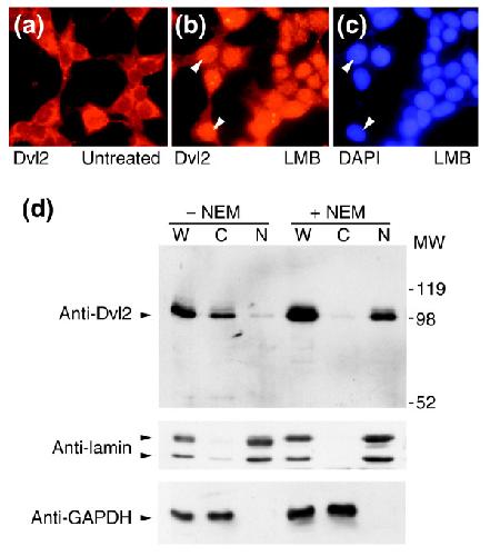 Figure 3. Endogenous Dsh shuttles between the cytoplasm and nucleus. Immunofluorescent staining of HEK293 cells with anti-Dvl2 antibodies reveals different subcellular localization of Dvl2 (a) without or (b) with LMB treatment. (c) DAPI staining shows the location of nuclei in the same field as (b); the arrowheads indicate corresponding nuclei in (b) and (c). (d) Distribution of endogenous Dvl2 recognized by anti-Dvl2 antibodies in the nuclear and the cytoplasmic fractions of Rat-1 fibroblasts. In the absence of NEM, Dvl2 is localized mainly in the cytoplasm (C), while after NEM treatment Dvl2 is exclusively localized in the nuclei (N). W, whole cell lysate. Antibodies to lamin and GAPDH show the separation of the nuclear and cytoplasmic fractions.