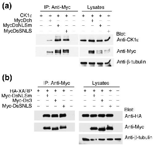 Figure 7. Dsh mutants retain the ability to bind CK1ε and XARP. Four-cell embryos were injected in four sites in the animal hemisphere with CK1ε, HA-XARP, Myc-tagged Dsh, DsNLSm, Ds3 or DsSNLS RNA alone (2 ng each) or in combinations as indicated. The embryonic lysates were collected at stage 10.5 for immunoprecipitation with anti-Myc antibodies. Co-immunoprecipitated (a) CK1ε or (b) HA-XARP was probed with anti-CK1ε or anti-HA antibodies; β-tubulin served as a loading control.