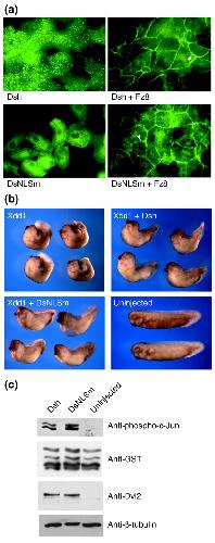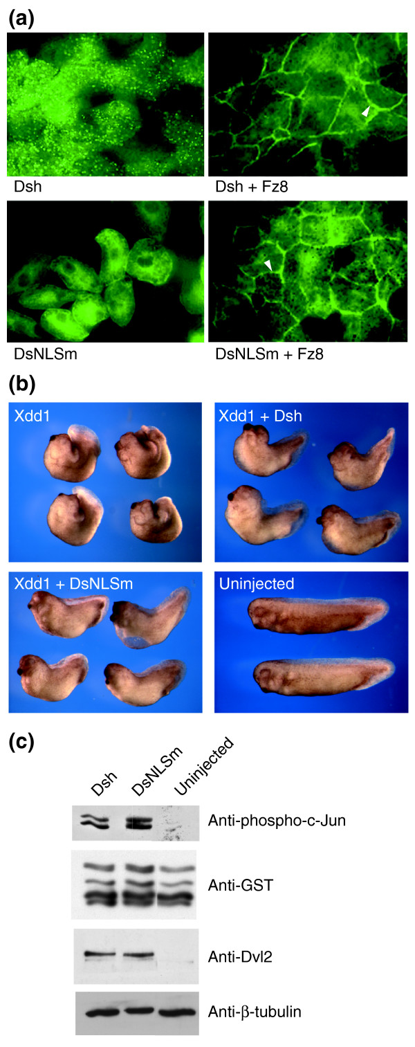 Figure 8. DsNLSm, defective in the β-catenin pathway, is active in noncanonical signaling. (a) Fz8-dependent recruitment of Dsh-GFP constructs to the cell membrane. Dsh-GFP or DsNLSm RNA (0.5 ng) was injected alone or with Fz8 RNA (1 ng) into two animal blastomeres at the 4â8-cell stage. GFP fluorescence was assessed in animal cap explants as in Figure 1b-d. Both Dsh and DsNLSm are efficiently recruited to the cell membrane by Fz8. Arrowheads point to cell membranes. (b) DsNLSm can rescue convergent extension defects caused by Xdd1. Four-cell embryos were injected with 0.6 ng Xdd1 RNA alone or together with 2 ng Dsh-GFP or DsNLSm RNA into two vegetal dorsal blastomeres. The injected embryos were allowed to develop until the sibling embryos reached stage 32. (c) Activation of JNK by the Dsh nuclear import mutant. Four animal blastomeres of four-cell embryos were each injected with 1 ng of RNAs encoding Dsh-GFP or DsNLSm. Embryonic lysates were collected at stage 10.5 for in vitro JNK activity assay using anti-phospho-specific c-Jun antibodies. Total GST-c-Jun levels were assessed with anti-GST antibodies. Dsh-GFP and DsNLSm were equally expressed, as monitored with anti-Dvl2 antibodies; β-tubulin served as a loading control.