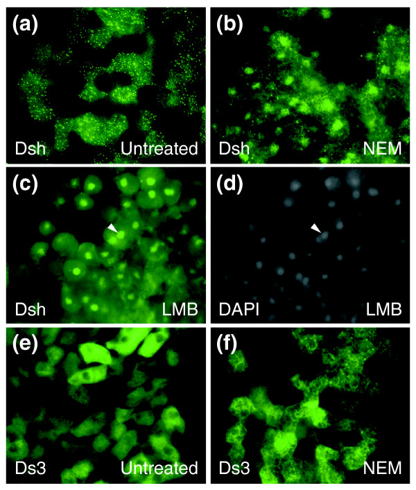 Figure 2. Accumulation of Dsh in the nucleus in the absence of nuclear export. (a-d) Dsh-GFP RNA (0.7 ng) was injected into two animal blastomeres of 4–8 cell embryos. Animal caps were excised at stage 10 and then left (a) untreated or (b) treated with 10 mM NEM or (c,d) 50 ng/ml leptomycin B (LMB), fixed and examined for GFP fluorescence. (a) Dsh-GFP is mainly localized to vesicular structures in the cytoplasm. In the presence of (b) NEM or (c) LMB, Dsh-GFP accumulates in the nucleus, as supported by (d) DAPI staining of nuclei in the same field as in (c). Nuclear staining is marked by arrowheads (c,d). (e,f) The Ds3 construct, lacking amino acids 334–381, remained in the cytoplasm in the (e) absence or (f) presence of NEM.