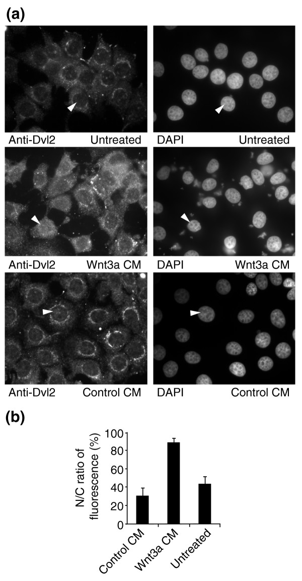 Figure 9. Nuclear translocation of Dvl2 upon Wnt3a treatment. (a) MCF7 cells were treated either with Wnt3a-conditioned or control medium for 6 h, fixed and immunostained with anti-Dvl2 antibodies. In control cells, cytoplasmic and perinuclear staining is visible. Wnt3a-conditioned, but not control, medium enhanced nuclear translocation of Dvl2. DAPI staining indicates the position of cell nuclei. Corresponding cells are shown by arrowheads. (b) Nuclear/cytoplasmic (N/C) ratios of fluorescence were calculated for each panel in (a) as the mean +/- standard deviation.