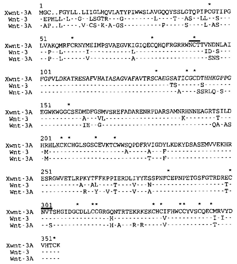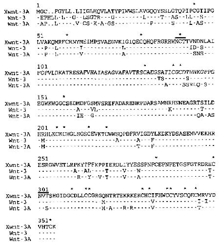3A, Wnt-3, and Wnt-3A. Dashes represent identical amino acids compared
