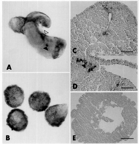ectoderm recombinants. (C) Neural tube signal, open arrow; bar= 50 #J.-m. (D) Apparent otic vesicle signal, closed arrow; bar = 25~tm. (E)