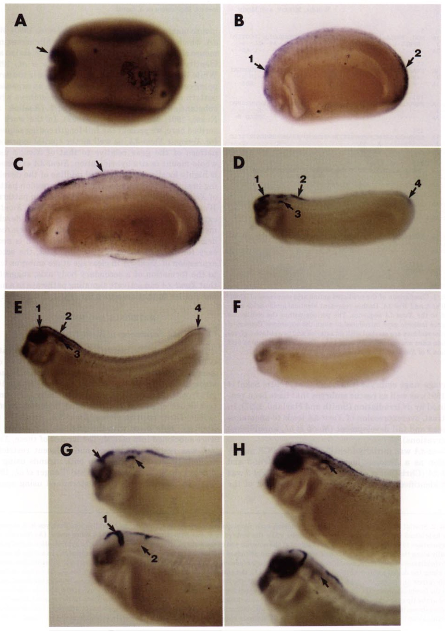 3) and at the tip of the tail (arrow 4). (F) A stage 27 embryo has no hybridization signal when probed with an Xwnt-3A sense probe. Stage 27 or 31