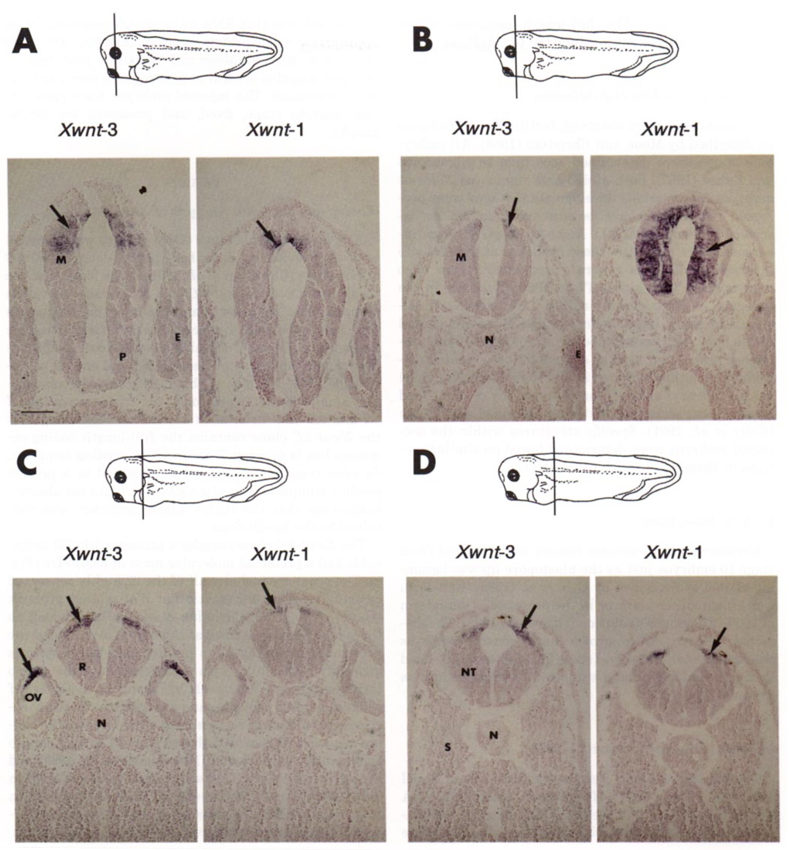 through the otic vesicle. (D) Transverse sections through the anterior neural tube. Arrows indicate specific expressi~n of either Xwnt-3A or
