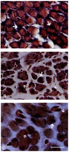 Female laryngeal muscle. Big arrows indicate nuclei surrounded by