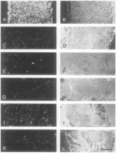 (right) views are shown. All sections were hybridized using 35S-labeled antisense strand except for C and D where the sense strand of f3-500 was