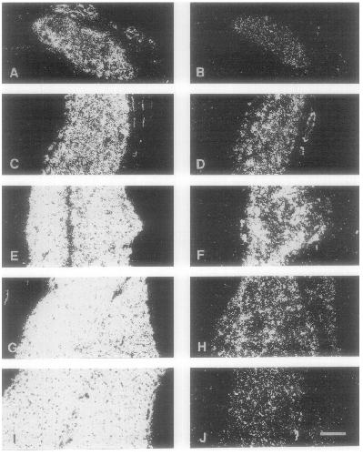 stage (PM) 0; C and D, PMl; E and F, PM2; G and H, PM3; I and J, PM5. Note that hybridization signal is confined to muscular tissue and is