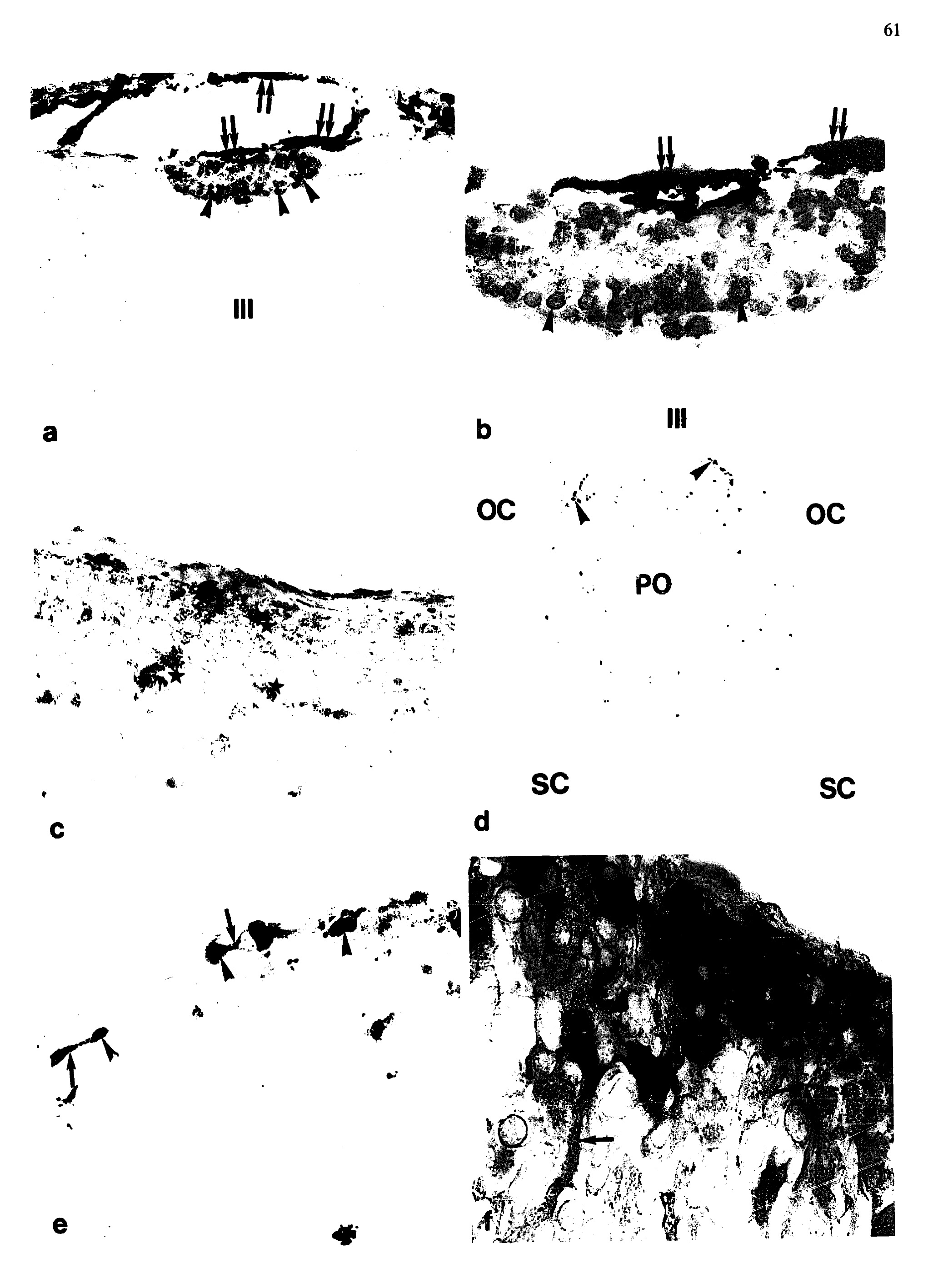 arrows, meningeal melanophores; Ill, third ventricle, c: pigeon. Recoverin immunoreaction occurs mainly in structures (*) protruding into the