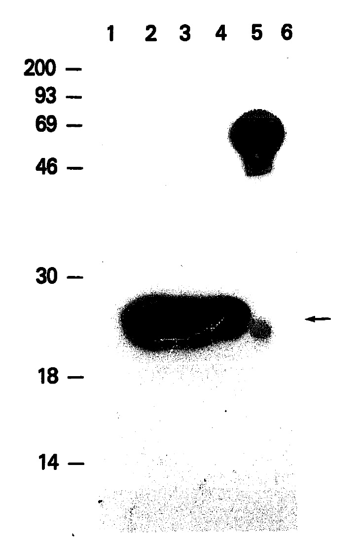 bovine; (5) human; (6) chicken (50/~g). M r is indicated on the left.
