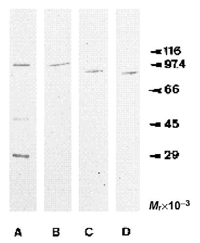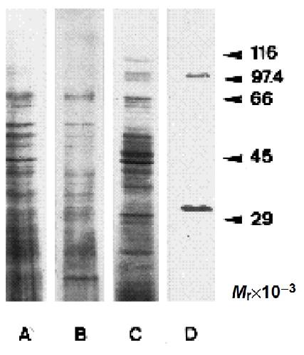 Q-Sepharose column; lane D, proteins of Mr 105,000 and 32,000