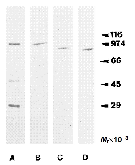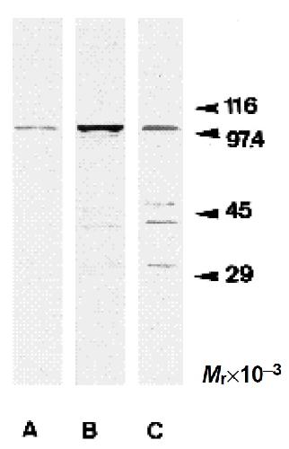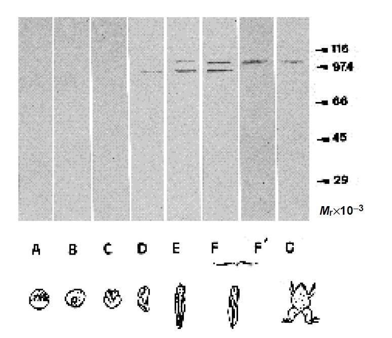 A protein of Mr 95,000 was detected in late embryos (stage 30). It