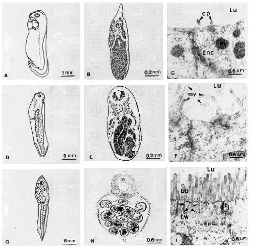 transparent fin up to the base over its whole length (A). The foregut is dorso-ventrally extended and its cavity is reduced (B).