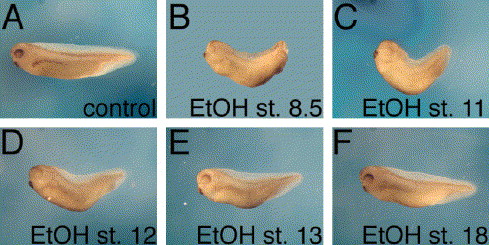 Fig. 1. Maximal sensitivity to EtOH exposure during late blastula/early gastrula. The window of sensitivity for EtOH treatment was determined. Embryos were exposed to 2.5% EtOH from different developmental stages onwards and studied at stage 36. The embryos were incubated in a medium without EtOH (A) or placed in 2.5% EtOH at stages 8.5 (B), 11 (C), 12 (D), 13 (E) and 18 (F). |