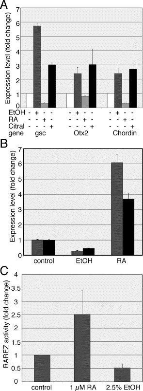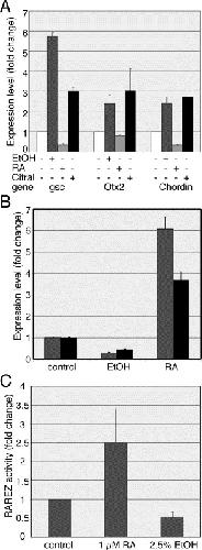 Fig. 5. EtOH and RA have opposed effects on gene expression. (A) Quantitative real-time PCR was employed to study the changes in gsc, Otx2 and chordin expression at st. 10.5 as a result of EtOH (2.5%), RA (1 μM) and Citral (60 μM) treatment. P < 0.05. (B) Quantitative real-time PCR analysis of Cyp26 expression as a result of EtOH and RA treatment. Whole embryos (grey) or dorsal marginal zone explants (black) were processed for RNA extraction at st. 10.5. P < 0.005. (C) Embryos were injected with the RAREZ, RA reporter plasmid, and subsequently treated with EtOH and RA. Quantitation of the reporter plasmid activity was performed (st. 10.5â11) using a chemiluminiscent substrate for Ã-galactosidase. P < 0.0005. |