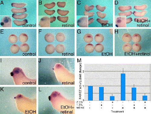 Fig. 9. EtOH can rescue the teratogenic effects of ROL and RAL. The rescue assays included phenotypic, gene expression and reporter plasmid activity assays. (AâD) A combined phenotypic and gene expression assay was performed at st. 33. Embryos were treated with: (A) control, (B) 70 μM ROL, (C) 1.5% EtOH and (D) 70 μM ROL together with 1.5% EtOH. The embryos were processed for in situ hybridization with probes for en2, Pax6 and XAG1. The insets are enlargements of the head region. (EâH) Rescue analysis during gastrulation based on the gsc expression pattern. The embryos were studied at st. 10.5 after treatment with (E) control, (F) 70 μM ROL (G) 1.5% EtOH and (H) 70 μM ROL and 1.5% EtOH. (IâL) EtOH can rescue the teratogenic effects of RAL. Embryos were studied at st. 33 for head phenotype and the expression of the en2, Pax6 and XAG1 markers. (I) control, (J) 5 μM RAL, (K) 1.5% EtOH and (L) 5 μM RAL and 1.5% EtOH. (M) Embryos were injected with the RAREZ plasmid, treated with ROL (150 μM), EtOH (1.5% or 2.5%), or a combination of both. The determination of the Ã-galactosidase activity was performed at st. 10.5â11. P < 0.0001. |