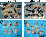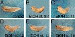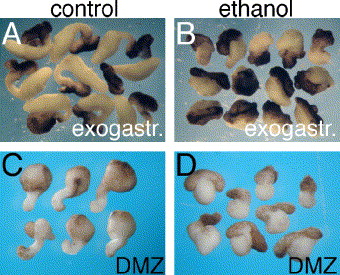 Fig. 3. The effect of EtOH on convergence-extension. Convergence-extension movements and elongation in EtOH-treated embryos were studied in exogastrulae and explanted dorsal marginal zones. Control (A) and EtOH-treated (B) exogastrulae and control (C) and EtOH-treated (D) explanted DMZs. |