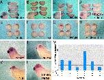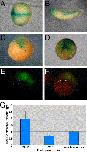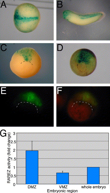 Fig. 8. Retinoic acid signaling in Spemann's organizer. The detection of RA signaling was performed using the RAREZ or RAREGFP reporter plasmids. (AâC) Embryos injected with the RAREZ plasmid and stained for Ã-galactosidase activity at stages (A) 13, (B) 30 and (C) 10.5. (D) RAREZ transgenic embryo at st. 11.5 stained for Ã-galactosidase activity. (E) Transgenic embryo with the RAREGFP plasmid during early/mid gastrula stages. (F) Same embryo as in (E) illuminated by epifluorescence and normal illumination to demonstrate the location of the GFP signal. The dashed line marks the position of the dorsal lip of the blastopore. (G) Quantitation of the RA signaling using the RAREZ reporter plasmid. At the onset of gastrulation, the DMZ and VMZ regions were explanted from embryos injected with the RAREZ plasmid and were processed for quantification of the Ã-galactosidase activity at st. 10.5â11. The control samples were whole embryos extracts. P < 0.015. |