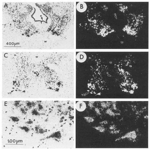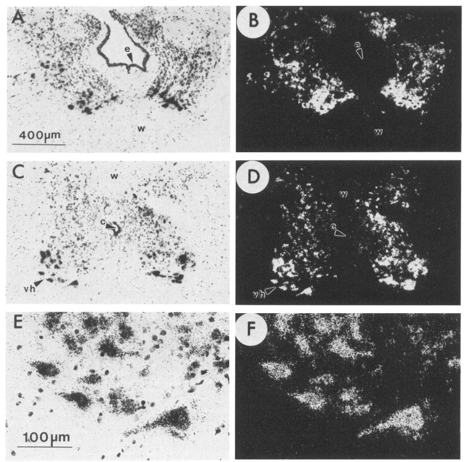 D. Cresyl violet-stained nuclei of unlabeled cells are seen in the bright-field photomicrographs. Abbreviations: e, ependymal cells; c, spinal cordcentral canal; w, white matter containing nuclei of glial cells. The 400 pm scale bar is for A-D. The 100 pm scale bar is for E and F.