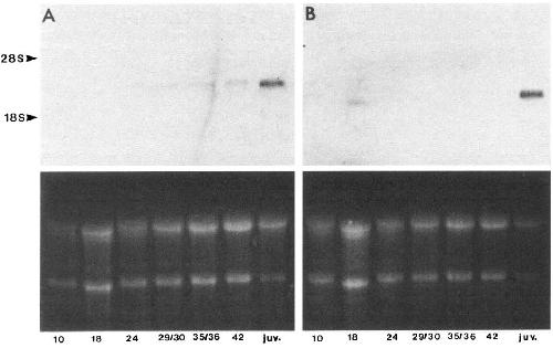from indicateds tageso r juvenile brain weres eparatedan d transferredto nitrocellulosea sd escribedB. lotsw ere then hybridized with identical
