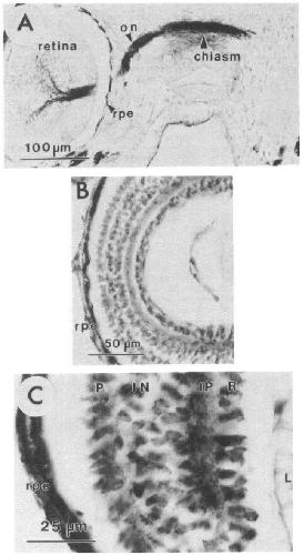 Figure 10. Anti-XNIF antibody immunoreactivity in the developing CNS and PNS. A, Horizontal section through the head of a stage 41 (3-dold)