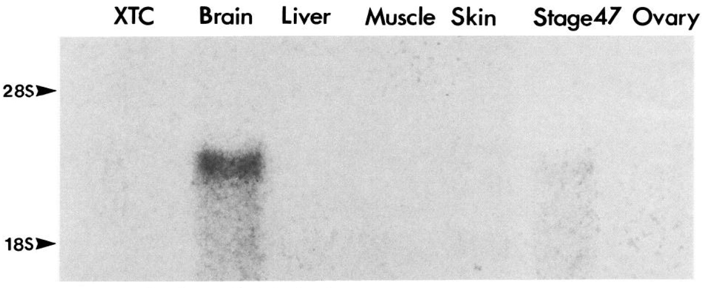Figure 4. Northern blot analysis of the tissue specific distribution of XNIF mRNA. Aliquots of 1 rcgo f polyA+ RNA from XTC (aX enopusk idney