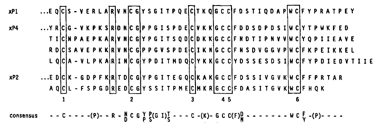 Similarly to epidermal growth factor (EGF) and EGF-like repeats, the "P-domain" represents a cysteine-rich module that has been detected in the past in a variety of polypeptides, as well as in high molecular weight proteins. Here, a precursor for a secretory polypeptide (xP2) is characterized that consists of two P-domains. xP2 has been discovered in Xenopus laevis with the help of the polymerase chain reaction. In contrast to all other P-domain peptides, it is synthesized in the skin but not in the stomach or the pancreas. By this and other criteria, it cannot be considered simply as the X. laevis homologue of recently described P-domain peptides, viz. the spasmolytic polypeptides (PSP/hSP/mSP). Furthermore, a polyclonal antiserum was generated against the deduced C-terminal end of xP2. Due to its immunoreactivity with granular glands, as well as with the epidermis, the possibility of a growth factor activity for xP2 in the germinal layer is discussed.