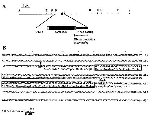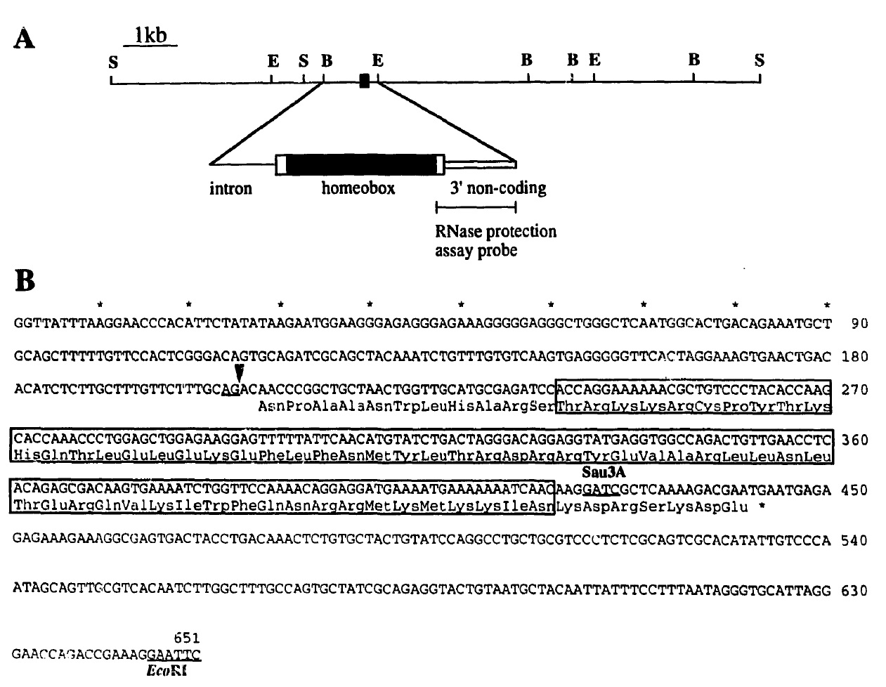is shown as a filled box and the Sau3A-EcoRI fragment used as the RNase protection assay probe is indicated. (B) Nucleotide sequence of the homeobox