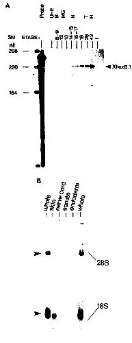 XhoxB. 1 transcripts and the positions of 28S and 18S rRNA are shown.