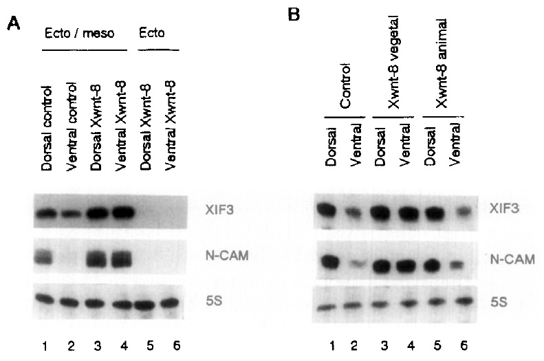 The ectoderm of early Xenopus gastrula is competent to become induced to neural tissue, but dorsal ectoderm is more neural competent than ventralectoderm. It is a tenable, but as yet untested possibility that the higher neural competence of dorsal gastrulaectoderm is dependent on the presence of the dorsal mesoderm. To test this hypothesis we overexpressed Xwnt-8 in order to ectopically induce dorsal mesoderm in the ventral side of the embryo. We found that this elevated the level of neural competence of ventralectoderm to that of dorsal ectoderm. The effect of Xwnt-8 on neural competence of ventralectoderm was strictly correlated with its ability to enhance the amount of dorsal structures. The data indicate that the presence of dorsal mesoderm is a prerequisite for establishing the differences in neural competence between gastrula dorsal and ventralectoderm.