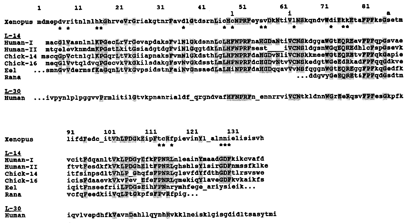 FIG. 7. Amino acid sequence comparison of the X. laevis 16-kDa lectin with other vertebrate S-Lac lectins. The amino acid
