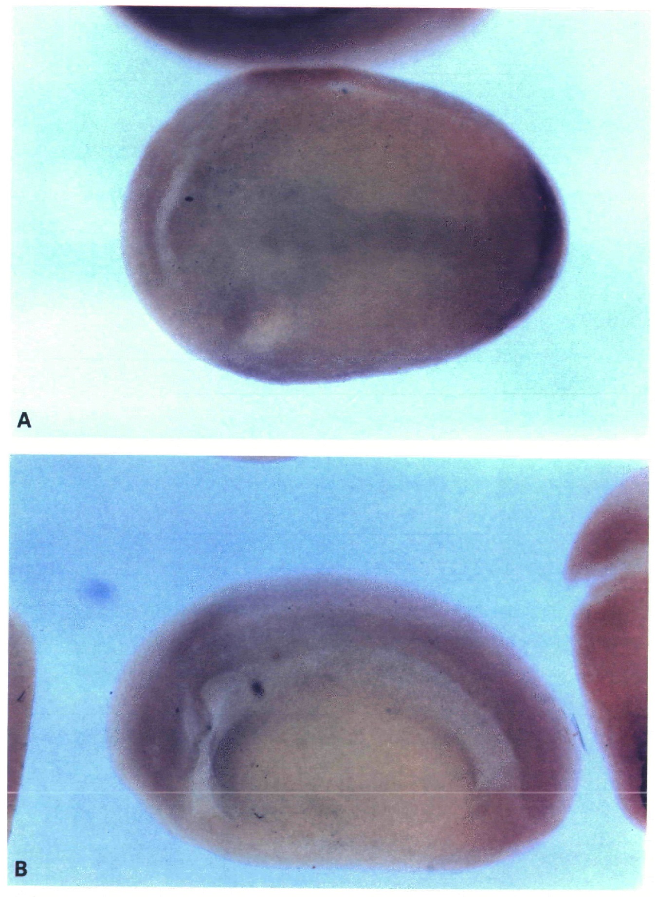 (B) Lateral view of a late neurulaembryo hybridized with a sense probe. Both embryos are oriented anterior-posterior
