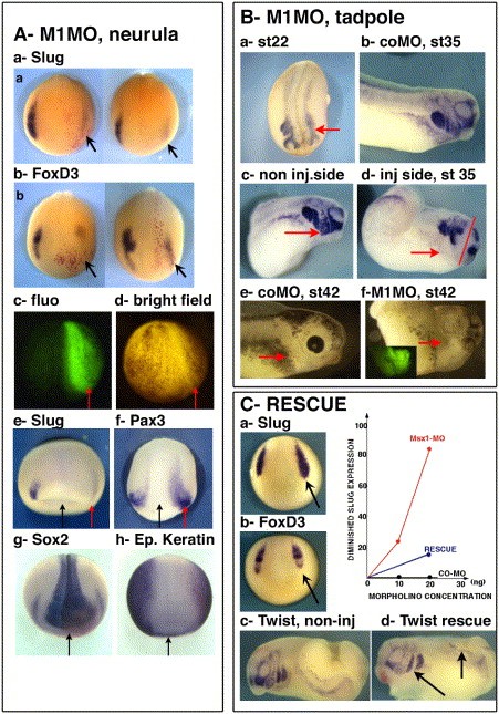 Figure 2. Antisense Morpholino Nucleotide-Mediated Depletion of Msx1 Activity Blocks Neural Crest Induction(A) Msx1-MO inhibited Slug (a) and FoxD3 (b) (stage 16 neurulae, dorsal view). Sibling embryos traced with fluorescence (c and d) showed decreased Slug (e) and enlarged Pax3 (red arrow, f), corresponding to increased Sox2 expression laterally (g) at the expense of the NC and ectoderm domain (h). Small arrow indicates the midline.(B) Phenotype of the Msx1 knockdown in tailbud and tadpoles. ISH for Twist (stage 22, a, dorsal view) and stage 35 (compare b and c to d). Tadpoles exhibit craniofacial defects and decreased melanocyte development (e and f). bâf, lateral views.(C) Dose response and rescue of Msx1 MO injections. At 20 ng dose, Slug expression is reduced in more than 80% of the embryos (red line). This effect is rescued (16%) by the coinjection of Msx1 MO with an Msx1 construct lacking the MO binding sequence (δXT-Msx1, blue line). The control MO (co-MO) does not affect Slug pattern (black line). ISH for rescue of Slug (a) and FoxD3 (b). Sequential injections of Msx1 MO and δXT-Msx1 also restore Twist expression in the cephalic and trunk NC (c, non injected side; d, injected side). |
