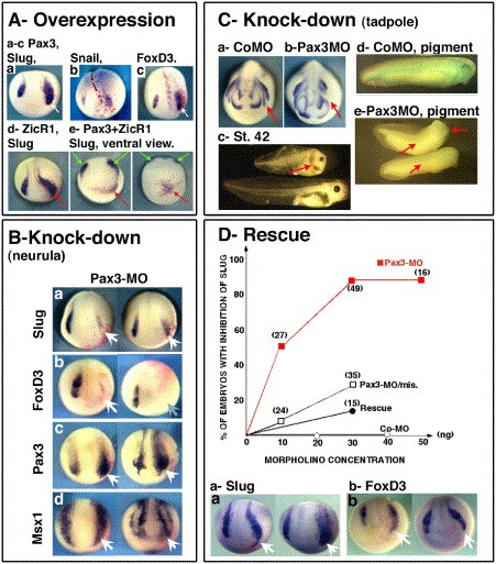 Figure 3. Pax3 Overexpression Increases Neural Crest Formation In Vivo, whereas Depletion of Pax3 Activity In Vivo Prevents Neural Crest Formation(A) Injections of 50â100 pg of Pax3 increase Slug (a), Snail (b), and FoxD3 (c) at the neural border as does ZicR1 (500 pg, d). In contrast, coinjections of Pax3 + ZicR1 expand NC at the neural border (not shown) and induce ectopic ventral Slug expression when targeted ventrally (e, ventral views). aâd, dorsal views.(B) Pax3-MO blocks Slug (a) and FoxD3 induction (b). In contrast, Pax3 mRNA is stabilized by the binding of the MO, resulting in an increased ISH signal (c), and Msx1 is unaffected (d).(C) Tadpole phenotype after Pax3 knockdown. Twist expression is strongly decreased (a and b, frontal views), embryos show fin and craniofacial defects (c), and pigment cells do not differentiate after bilateral injections (d amd e, albinos eggs fertilized with sperm from pigmented male).(D) Pax3-MO injection phenotype is dose dependent. More than 80% of the embryos show decreased NC markers expression at doses above 30 ng (red square). An MO with two nucleotide mismatch (Pax3-MO-mis, open squares) downregulates Slug expression in only 30% of the embryos, and the control-MO has no effect (circles). Mouse Pax3 mRNA rescues the knockdown phenotype (rescue, black circles): ISH for Slug (a) and FoxD3 (b). |
