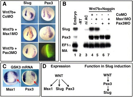 Figure 5. Neural Crest Induction by the WNT Pathway Requires Pax3, but Not Msx1 Activity(A) In vivo overexpression of Wnt7b in the neural fold results in Slug and Pax3 in the presence of control or Msx1 MOs. In contrast, Pax3-MO coinjections block Wnt7b activity and result in downregulation of Slug in the neural fold. (MOs are traced with fluorescence, and RNAs are traced with LacZ).(B) RT-PCR analysis of animal caps injected with Wnt7b + Noggin in the presence of control (lane 4), Msx1 (lanes 5 and 7), and Pax3 (lanes 6 and 7) MOs. Msx1-MO does not prevent Pax3 nor Slug induction, whereas Pax3-MO reduces Slug induction.(C) The activity of the canonical WNT pathway is required for activation of Msx1 and Pax3 in the neural folds: β-catenin MO (Supplemental Data) or of GSK3 injections in one cell at the 16 cell stage.(D) Model part 2: activation of Msx1 and Pax3 expression in the embryo requires an active WNT signaling, but WNT pathway depends on Pax3 function only for Slug induction. |
