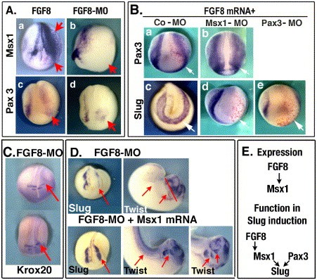 Figure 6. FGF8 Neural Crest Inducing Properties Requires Msx1 Activity(A) Msx1 exhibits a strong response to FGF8 overexpression (50 pg) and is broadly activated on the injected side, including lateral and ventral areas of the embryo (a). The FGF8-AMO (40 ng) abolishes Msx1 expression (b). FGF8 overexpression does not increase the level of Pax3 expression but, rather, expands the Pax3 domain (c). FGF8-MO decreases Pax3 expression partially on the injected side (d).(B) Fgf8 mRNA injections (125â250 pg) either alone or with the control MO expanded greatly Slug expression around the neural plate (c). At this dose, Pax3 expression also encompassed the ANF (a). In the presence of Msx1 MO, FGF8 induction of Slug is abolished (d), whereas Pax3 remains as with control (b). Pax3-MO also blocks Slug activation by FGF8 in vivo.(C) FGF8MO does not affect global patterning of the neural plate as shown by the mild shift in Krox20 expression by rhombomeres three and five but, rather, prevents NC induction as seen by the loss of rhombomere five NC (arrows).(D) Msx1 overexpression rescued the loss of FGF8 activity, showing that Msx1 mediates FGF8 activity. Both Slug (stage 19 tailbud) and Twist (stage 35 tadpoles) are efficiently rescued both in cephalic NC (individual streams are rescued) and trunk NC.(E) Model part 3: FGF8 controls Msx1 expression in vivo independently of WNTs, but FGF8 depends on both Msx1 and Pax3 for inducing Slug. |