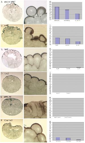 Fig. 2. aPKC overexpression produces rounded, protruding, hyper-pigmented cells. (A,B) Mouse and Xenopus aPKC overexpression produced embryos with protruding superficial cells and extended pigmented (apical) surface when compared with controls (C,D). (E) Overexpression of a truncated version of the Xenopus tropicalis protein, PKC NT, which lacks the entire kinase domain, failed to produce this phenotype. (F) Crumbs3 overexpression caused cell protrusion and over-apicalisation, similar to that of aPKC, but was less effective in that the percentage of affected embryos was lower. Quantification was carried out blind, by counting the number of embryos with protruding cells. Right panels show the percentage of affected embryos at each concentration of injected RNA. Each experiment was carried out at least three times and the average is shown.
