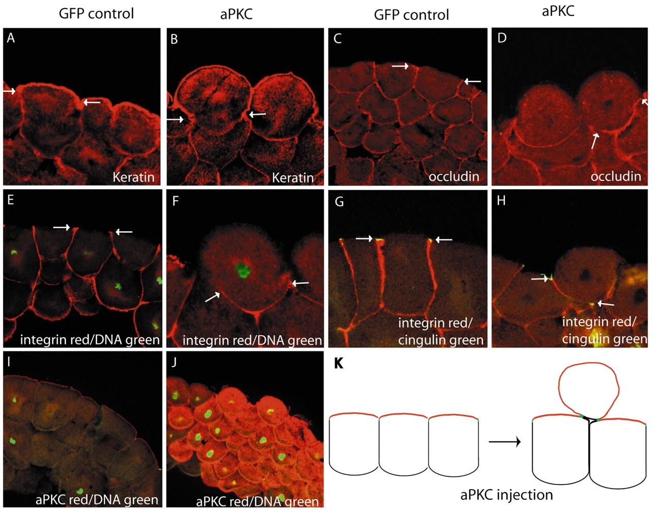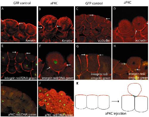 Fig. 3. aPKC is sufficient to promote apical and inhibit basal lateral membrane identity without disrupting tight junctions. (A,B) aPKC overexpression (B) caused expansion of the apical marker keratin compared with GFP control (A). (C-F) aPKC caused reduction in the basolateral markers, occludin (D) and β1-integrin (F) compared with controls (C,E). (G,H) aPKC caused tight junctions (as marked by cingulin) to be maintained but relocated to the new apicobasolateral border. The borders of the markers used in each panel are delineated with arrows. (I,J) aPKC staining in GFP-injected controls (I) and aPKC staining in aPKC-injected (J) embryos. The apicalised cells have inherited overexpressed aPKC. (K) Diagrammatic representation of the result; aPKC causes protruding hyper-apical cells, which still have tight junction markers. Apical, red; basolateral, black; tight junctions, green. Albino embryos were injected with aPKC RNA and stained for antibody markers of cell polarity. Each experiment was carried out three times.
