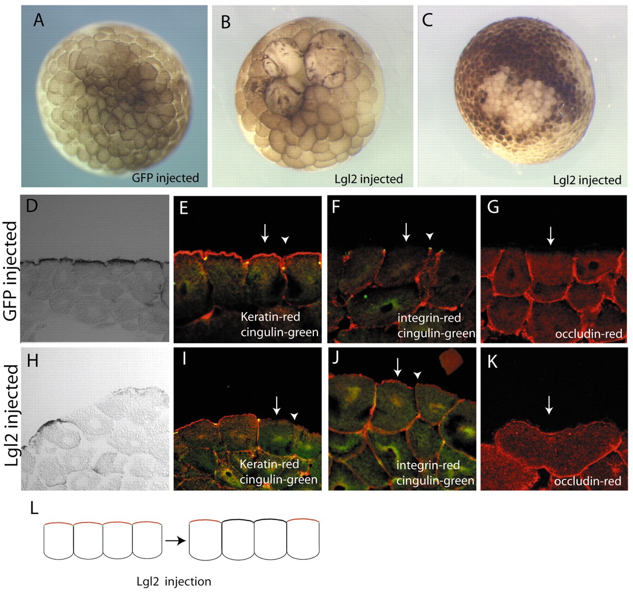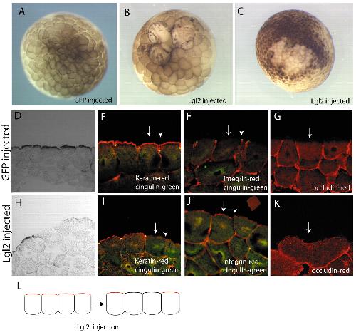 Fig. 5. Lgl2 promotes basolateral and inhibits apical identity. (A) Injection of 5 ng GFP did not affect the cells. (B,C) Injection of Xenopus Lgl2 caused loss of pigment and also a block in cytokinesis at high doses (B, 5 ng; C, 0.5 ng). (D-K) Injection of GFP (D-G) or Lgl2 (H-K) and immunostaining with the markers shown in each panel. GFP-injected embryos were entirely normal. (I) Injection of Lgl2 caused a reduction in keratin to the levels normally seen in the basolateral region (arrow) and loss of tight junctions (cingulin, arrowhead). (J,K) Injection of Lgl2 caused ectopic localisation ofβ 1-integrin (J) and occludin (K) to the apical side (arrow) and loss of tight junctions (arrowhead). (L) diagrammatic representation of phenotype, colours as above. Experiments were carried out three times in both albino and pigmented embryos (except for the keratin where the staining is obscured by the pigment and therefore was carried out only in albinos), and the same result was obtained in both.