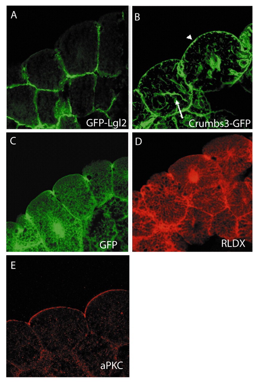 Fig. 1. aPKC, Crumbs3 and Lgl2 show specific localisation in early epithelial cells. (A) GFP-Lgl2 localised exclusively to the basolateral membrane at stage 8. (B) Crumbs3-GFP localised to the apical (arrowhead) and basolateral membrane at stage 8, and to unknown internal structures (arrow). (C) GFP control. The examples shown are after injecting 1 ng of RNA. (D) RLDX control. GFP localised nonspecifically in the cytoplasm, nucleus and points of cell contact, as did the lineage label RLDX. Because of the high yolk content of early Xenopus cells, cytoplasmic fluorescence of the controls has a latticed appearance. This is very distinct from the localisation of the fusion proteins shown. (E) Antibody staining showing that aPKC localises to the apical membrane.