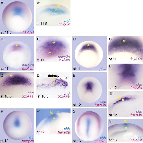 Fig. 2. Comparative expression patterns of hairy2a, chd, foxa4a and shh. Double in situ hybridization of (A-Aâ²), chd (turquoise) and hairy2a (magenta); (B,Bâ²) foxa4a (magenta) and hairy2a (purple); (D-Eâ²) chd (purple) and foxa4a (magenta); (F-Gâ²) shh (turquoise) and hairy2a (magenta). (C,Câ²) in situ hybridization of foxa4a. (Aâ²,Dâ²,Eâ²,Fâ²) Sagittal sections of the embryos shown in A,D,E,F respectively. (Gâ²) Transverse section of the embryo shown in G. Notice that in Fâ²,Gâ² the co-expression domain of shh and hairy2a in the FP can be distinguished because of the purplish colour resulting from the overlapping of magenta and turquoise staining. Stages (st) are indicated at the bottom of each figure; fp, prospective floor plate; n, notochord; dnimz, dorsal non-involuting marginal zone; dimz, dorsal involuting marginal zone; dotted line indicates the presumptive limit of involution. See text for details. |